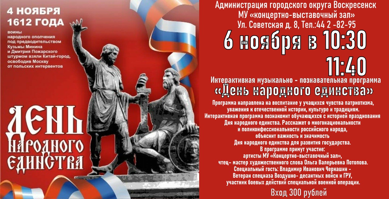 Приглашаем юных исследователей на увлекательную музыкально-познавательную программу "День народного единства"! Вместе мы отправимся в захватывающее путешествие по страницам истории России, чтобы узнать о событиях, объединивших наш народ в трудные времена. Ребята познакомятся с героями, отстоявшими независимость нашей Родины, и поймут, что сила – в единстве! В программе: • Интерактивная лекция-беседа: о событиях Смутного времени, подвиге Минина и Пожарского, и значении Дня народного единства. • Музыкальные номера: патриотические песни, отражающие культуру и традиции разных народов России. • Знакомство с культурой разных народов, проживающих в России: через музыку и интерактивные задания. В ходе программы дети узнают: • Об истории возникновения Дня народного единства. • О подвиге Минина и Пожарского и их роли в освобождении Москвы от польских интервентов. • О том, что единство – это сила, помогающая преодолевать любые трудности. • О важности уважения к культуре и традициям разных народов, населяющих Россию. "День народного единства" – это не просто познавательная программа, это возможность: • Почувствовать себя частью великой истории. • Воспитать чувство патриотизма и гордости за свою страну. • Развить командный дух и умение работать вместе. • Расширить свой кругозор и узнать много нового и интересного. • Весело и с пользой провести время!