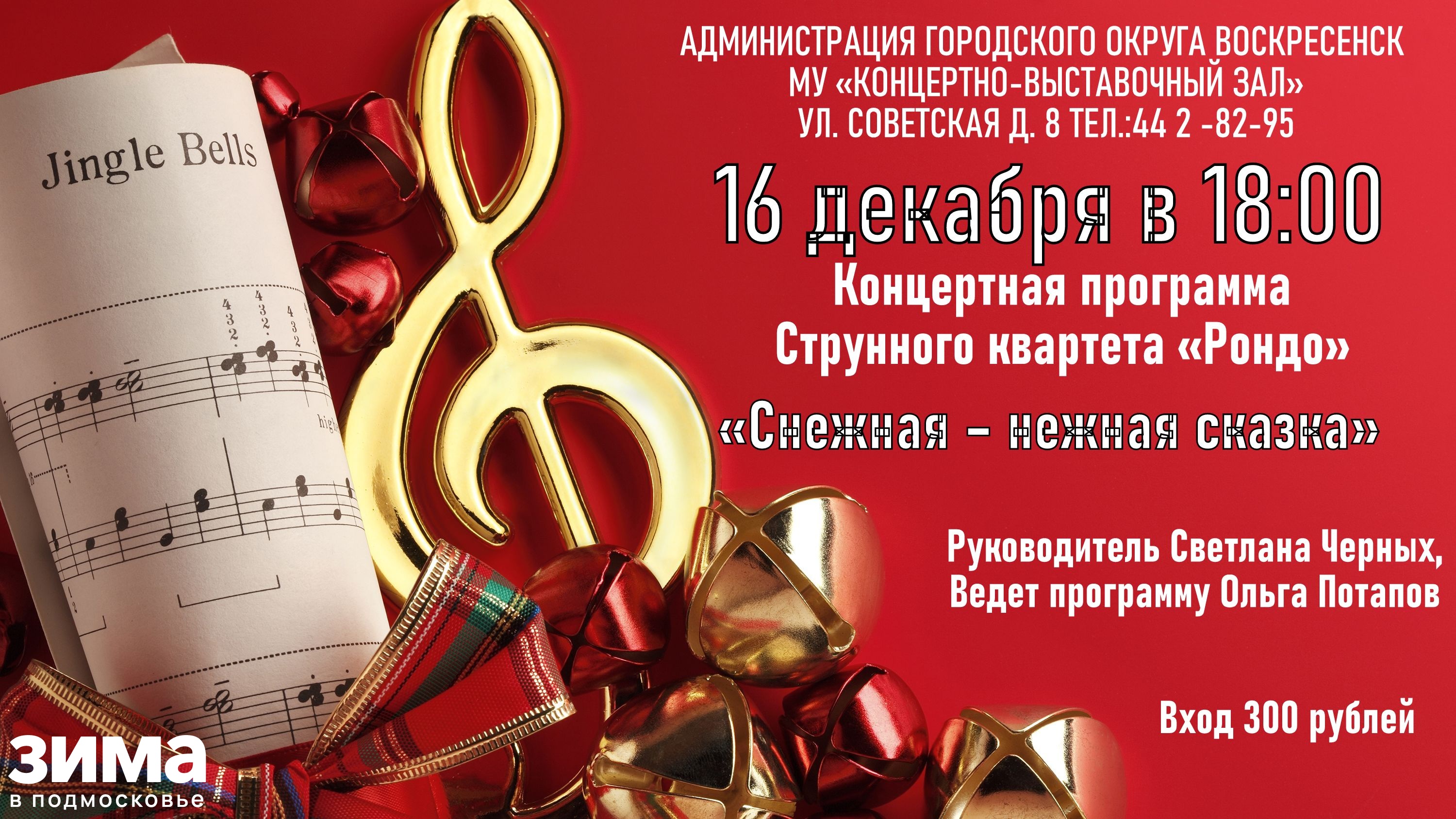 «Погрузитесь в атмосферу зимнего волшебства с концертной программой «Снежная – нежная сказка» в исполнении Струнного квартета «Рондо» (Руководитель Светлана Александровна Черных)! Для дорогих гостей подготовлено путешествие в мир снежных грез, нежных мелодий и завораживающих звуков. В этой программе гармонично переплелись виртуозное исполнение, трогательные образы и сказочная атмосфера, создавая незабываемое впечатление. Позвольте музыке «Рондо» унести вас в мир грез и подарить ощущение чуда!».